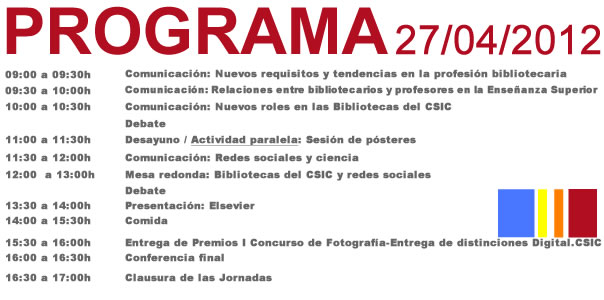 Con el fin de abordar adecuadamente las transformaciones que se producen continuamente en la gestión de la información científica y analizar los cambios que conllevan en la profesión bibliotecaria se convocan para los días 26-27 de abril de 2012 las Cuartas Jornadas de Análisis de la Red de Bibliotecas del CSIC bajo el lema "Bibliotecas para la Ciencia en el siglo XXI: nuevos entornos y retos profesionales" con el objetivo de debatir los temas que en la actualidad preocupan a las bibliotecas del CSIC, con especial atención a la calidad de los servicios a los usuarios y las necesidades de adaptación del personal bibliotecario.